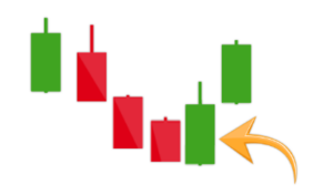 Ej. Vela roja supera la verde sobre resistencia importante, siguiendo la tendencia bajista
